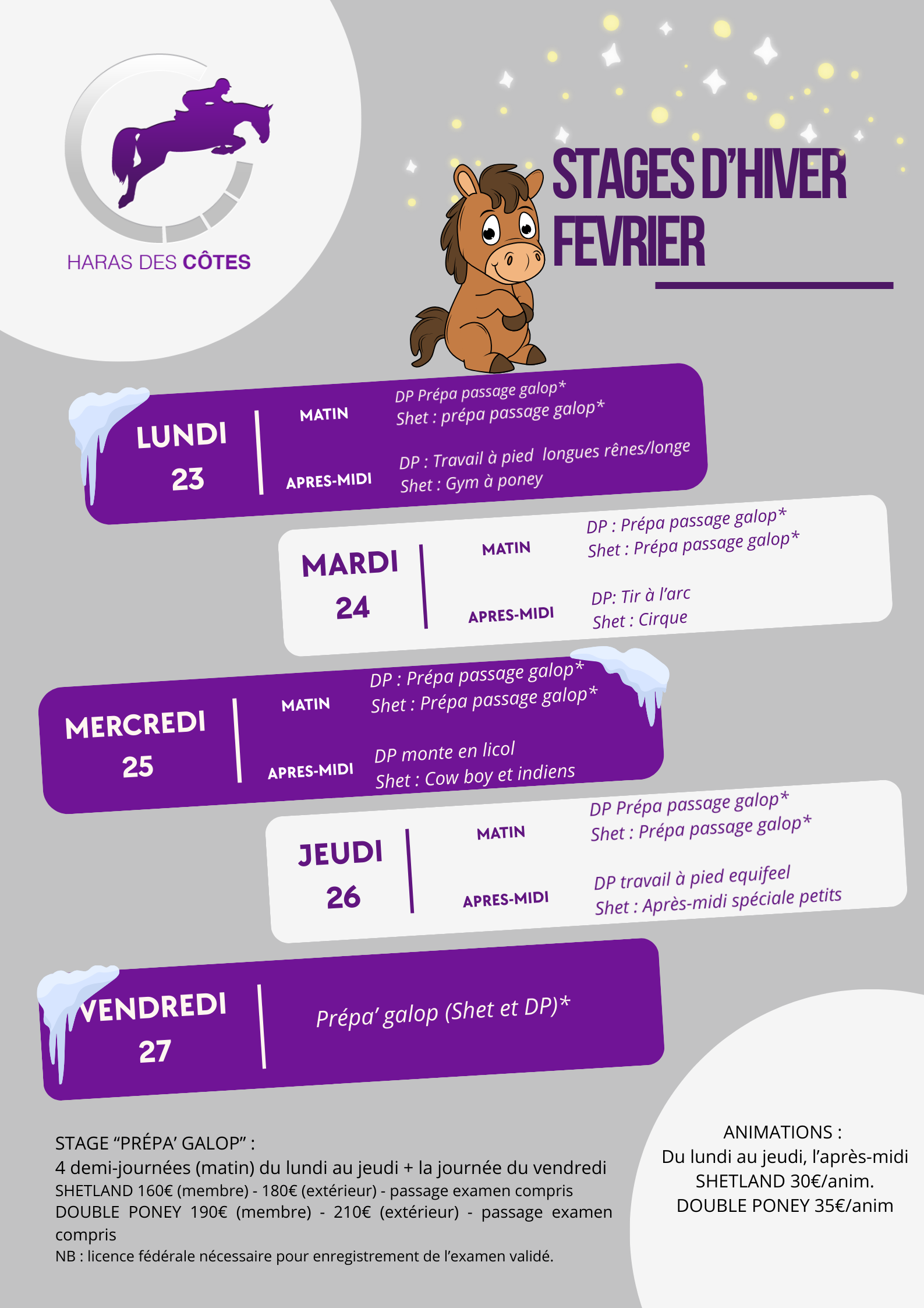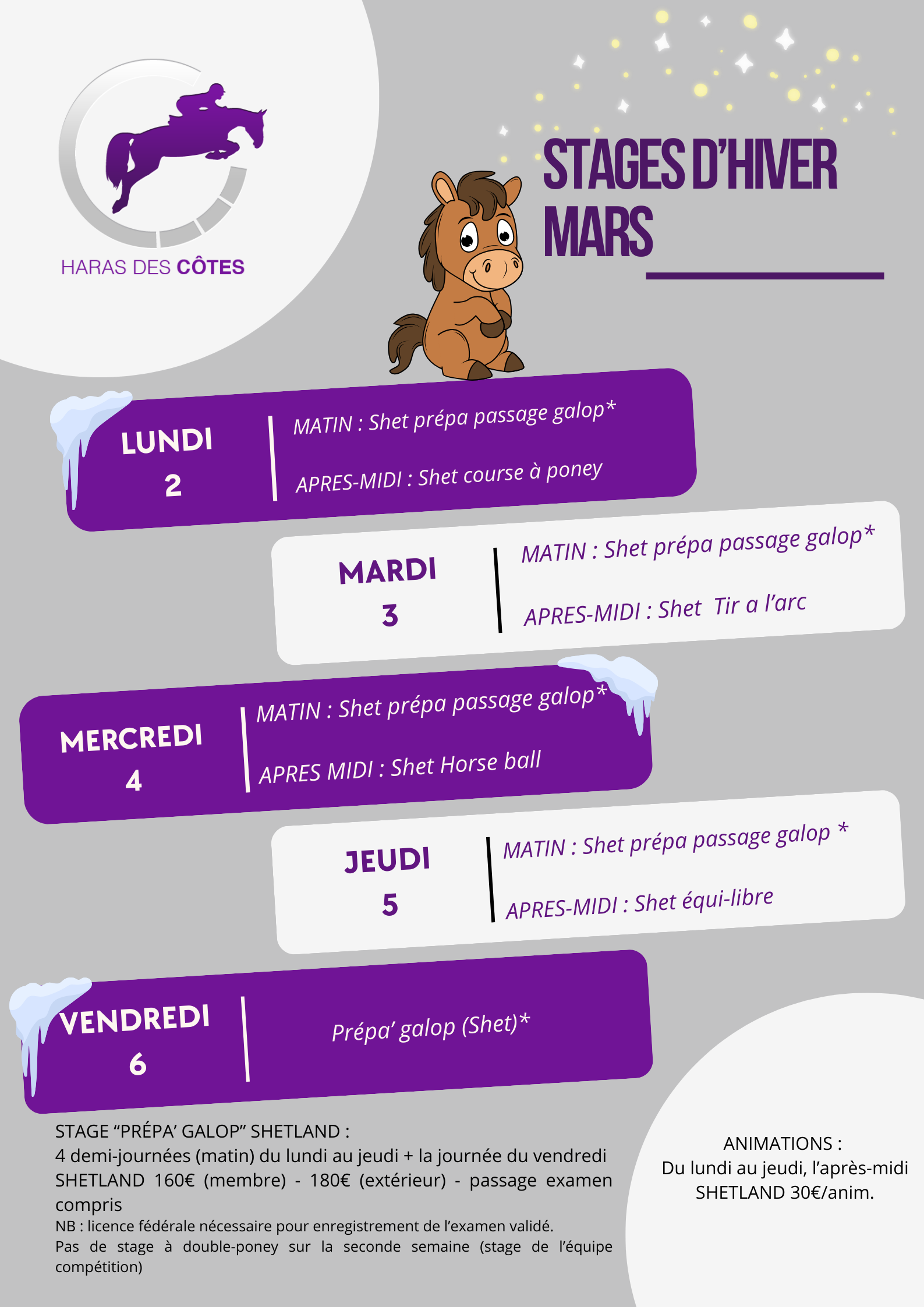 Pendant les vacances d'hiver, le Haras des Côtes propose des stages d'équitation et animations adaptés à chaque âge et à chaque niveau, dans une ambiance conviviale et bienveillante.
